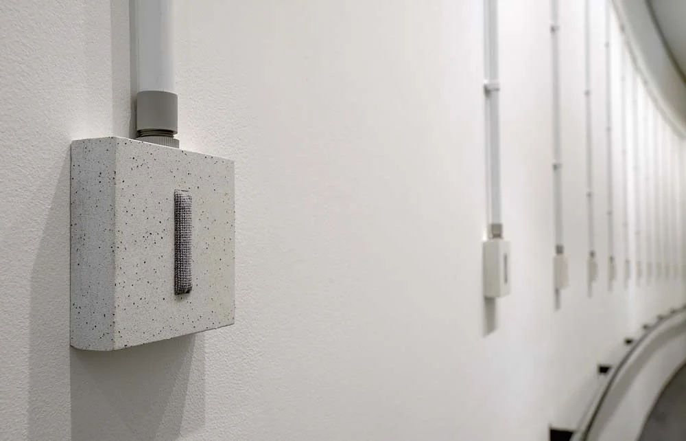 Extending areas of investigation instigated by the handrail/barrier forms (see Arbitrary Divisions), this body of studio enquiry continued to address ideas about repetitive spatial practices and embodied corporeality. Ongoing concerns informing the developing practice included an interest in touch and the way that ubiquitous aspects of the built environment such as door handles and light switches mediate between the body and space, instigate unconscious routinely repeated patterns of behaviour and mark points of transition. The studio enquiry also found correspondence with earlier references to plain sewing in the way that these often overlooked objects of material culture have a quotidian utilitarian anonymity but nevertheless are crucial to the functioning of our everyday activities.
